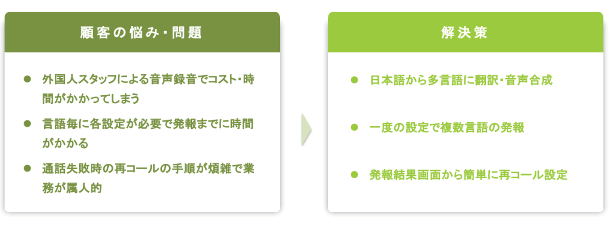 以上3つを喫緊の課題と捉え、この3点を解消できる革新的な多言語Autocallを開発することを決定いたしました。