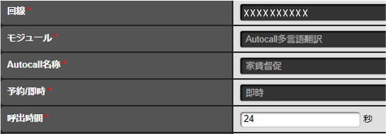 作成したガイダンスごとに設定するため複数の言語に翻訳していても1回の操作で設定できます。電話番号と言語コードで指定すれば複数言語の同時発信も可能です。まず、設定一覧画面から発信を選び、回線(発信元の電話番号)を選びます。モジュールはAutocall多言語翻訳を、Autocall名称は発報したいガイダンス名を選択します。発報のタイミングは即時を選ぶか、もしくは発報したい日時を入力します。発報予約は30日先まで登録可能です。呼出時間(着信側の鳴動時間)も設定できます。また発報先については、個別入力とCSVファイルでの一括登録を行えます。