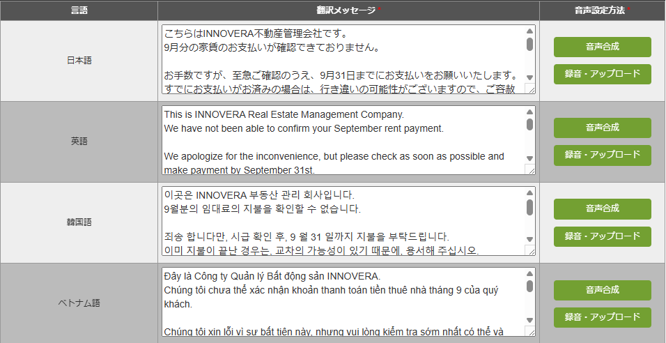 クラウドPBX「INNOVERA」Autocall機能の多言語対応試用版は、テキストで入力した日本語の音声ガイダンスを、他言語に翻訳・音声合成し、即時または予約で発報できるサービスです。