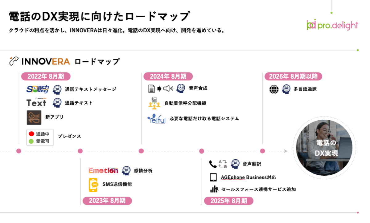 また、プロディライトはクラウドPBX「INNOVERA」のロードマップで2026年8月期以降に多言語翻訳機能をリリースすることを掲げています。Autocall機能の多言語対応は、その第一歩でもあります。
