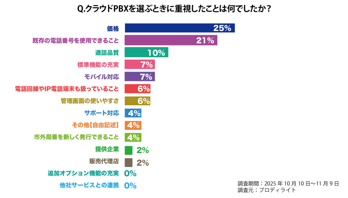 最も多い回答は「価格(25%)」となりました。続いて多い回答は「既存の電話番号を使用できること(21%)」です。これらは「機能の充実」「モバイル対応」を求める回答よりもかなり多いことから、企業は機能面よりもコストや電話番号を維持できることを重視し、堅実な選択を行うことが判明しました。
