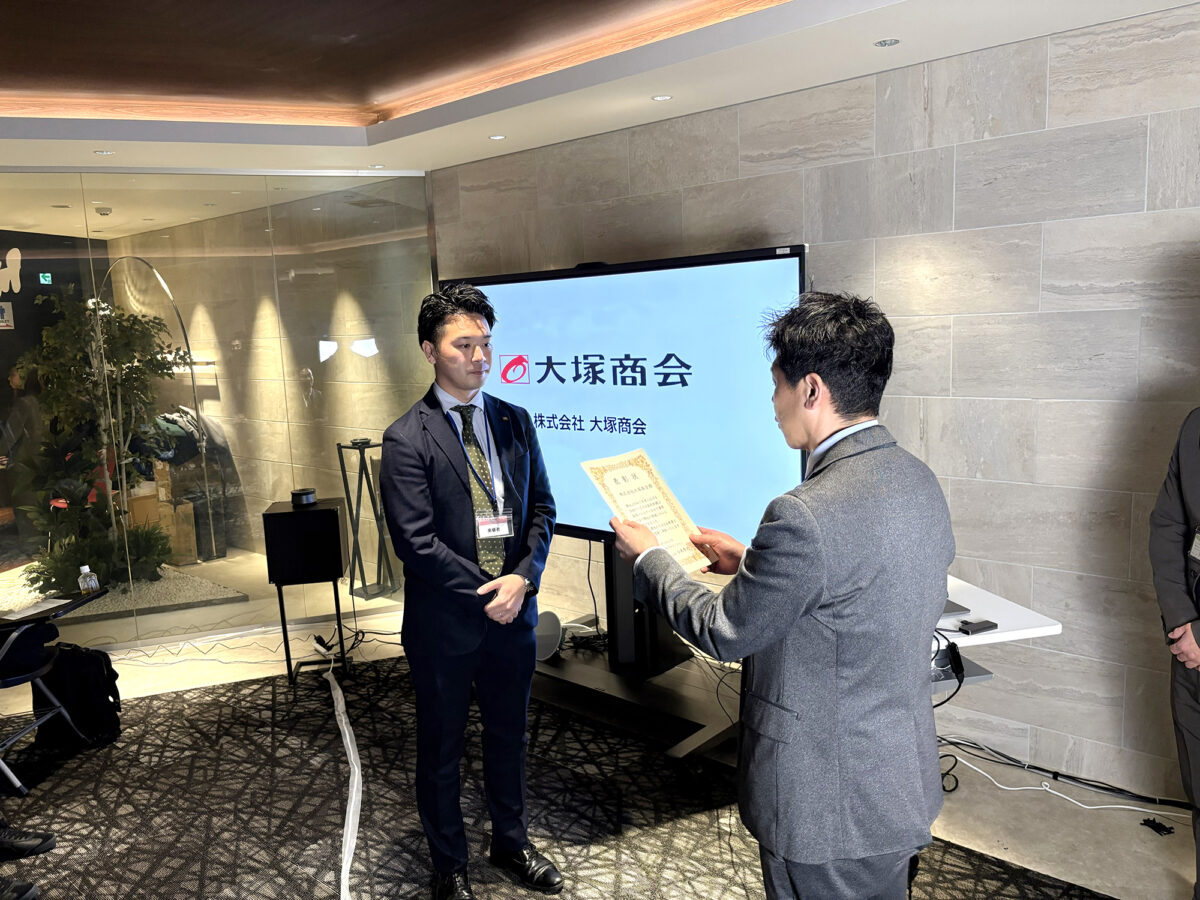 今年のNo.1賞は、ゴールドパートナーとして昨年最も多くINNOVERAを販売いただいた株式会社大塚商会(本社:東京都千代田区、代表取締役社長:大塚裕司、以下大塚商会)でした。大塚商会のご担当者様には当日、東京から大阪にあるプロディライト本社までお越しいただき、そのご厚意に心より感謝申し上げながら表彰させていただきました。