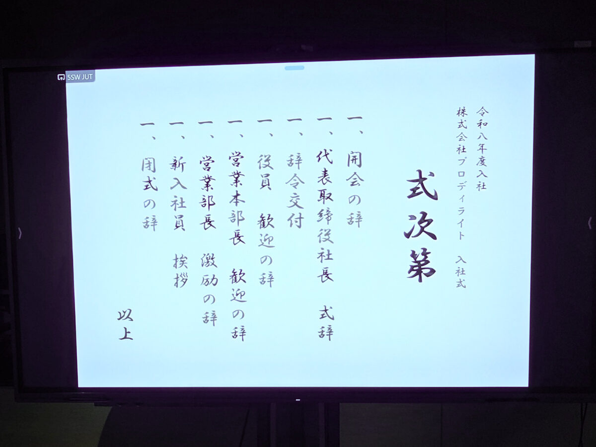 本入社式は、プロディライトにとって記念すべき初の新卒採用社員を迎える、節目の式典として開催されたもので、当日は代表取締役社長 小南をはじめ、役員、ならびに新入社員の上司となる営業本部長や営業部長が出席いたしました。