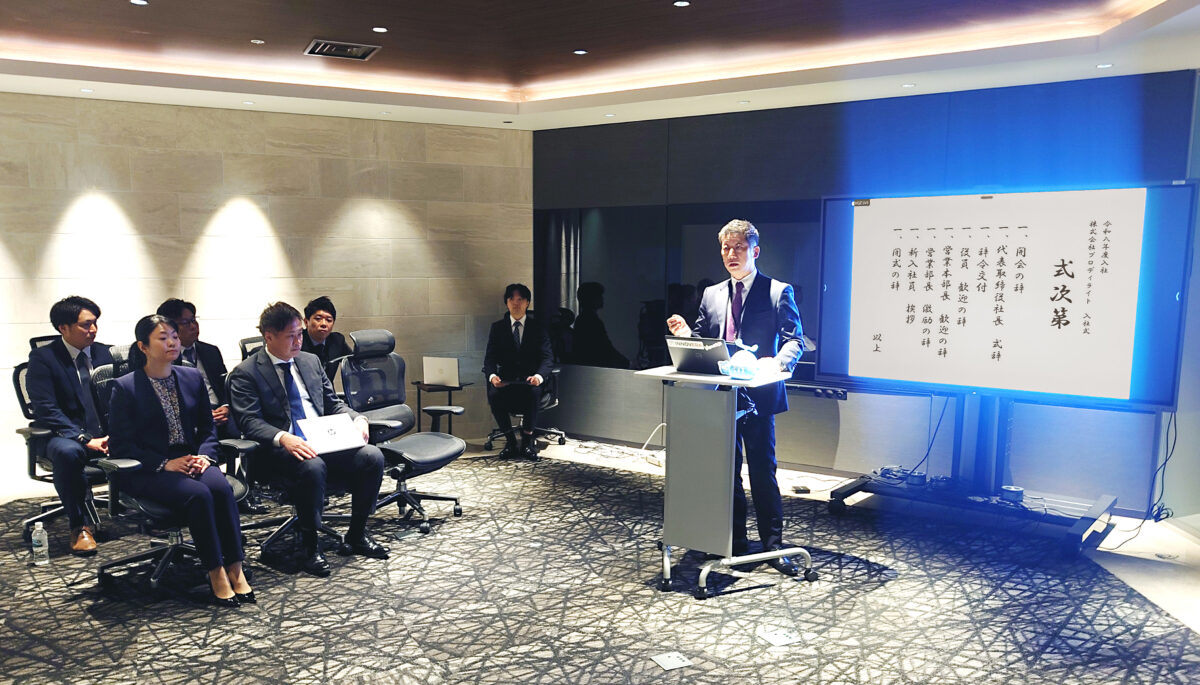 また、新入社員による挨拶の場では、一人ひとりが自己紹介を行い、入社にあたっての抱負や将来の目標などを力強く語りました。その新社会人としての決意と新鮮な意気込みが感じられる姿にプロディライトの未来を担う新たな仲間を歓迎する温かな拍手が送られ、終始和やかで前向きな雰囲気の中、式典は執り行われました。